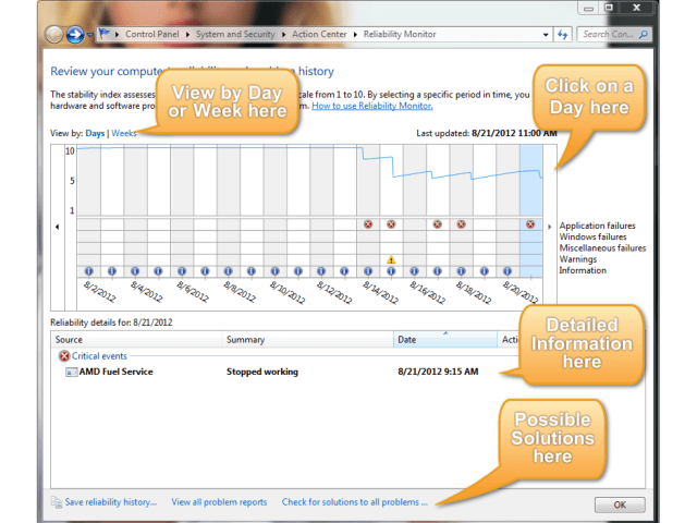 Where this utility shines, however, is that it will give you a heads-up on where some problems may exist. You might not even be aware of them before running the Reliability Monitor.