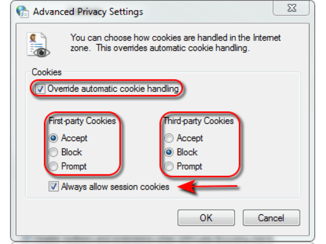 In the above window you can see that we have overridden the automatic cookie handling, accepted first-party cookies, and disabled third-party cookies. Here’s the trick – Always allow session cookies.