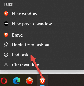 If an application becomes unresponsive and hangs, right-click its icon in the Taskbar and select the option to End task: