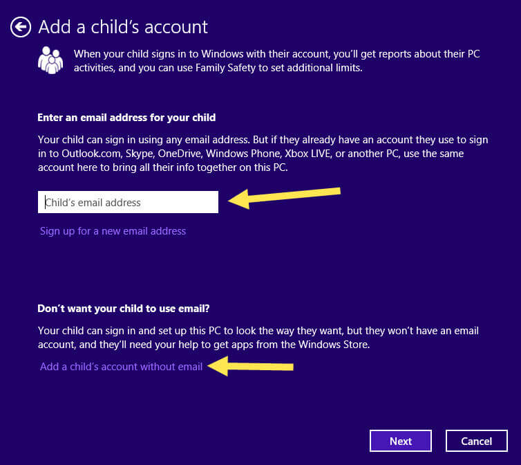 This is the place where you have to decide how you want to set up your child’s account. You have 2 choices here; the first one is if you think your child is mature enough to give them a Microsoft Account which will give them access to their Xbox Live, Skype or whatever else they are connected to with Microsoft. If they have one set up already just type that info in. If you’d rather not do it that way then choose the option to set them up without an email account. In this article I will walk you through the no email option.
