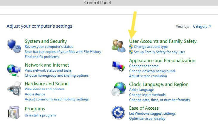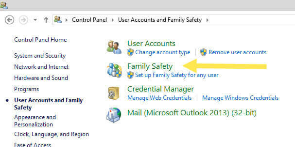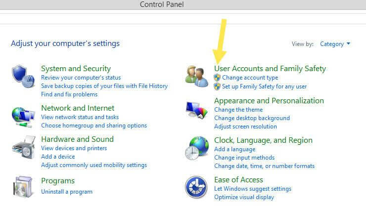 Now you will need to click on the “User Accounts and Family Safety” link, Which is on the right of your screen. Click it.