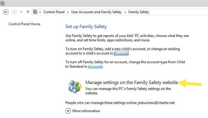 After you click that it will take you to the following screen. Here you will want to click on “Manage settings on the Family Safety website”, which will take you online.