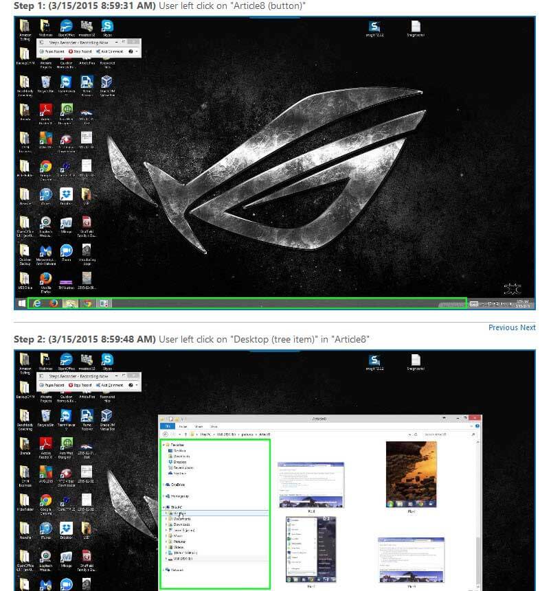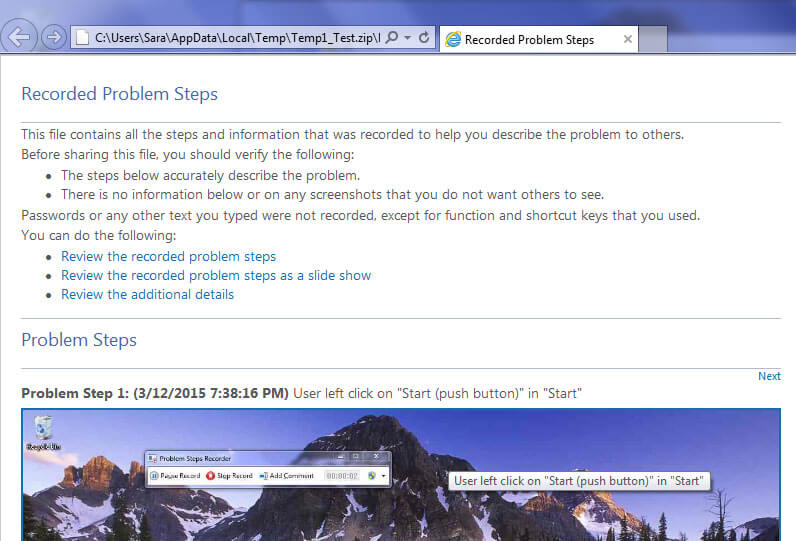 This file will display in your IE browser by default or whichever browser you use. As you can see this will layout the steps you took with pictures and captions. Very helpful when trying to help figure out what could have gone wrong.