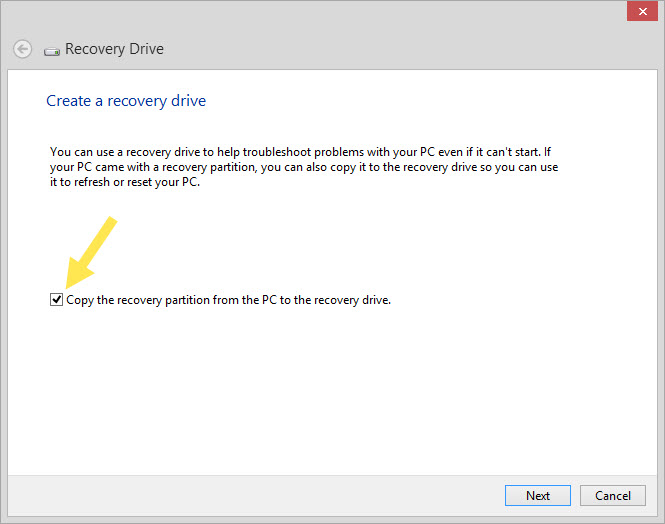 - Now the “Create a recovery drive” box will appear. Here you want to make sure the “Copy the recovery partition from the PC to the recovery drive” box is checked.