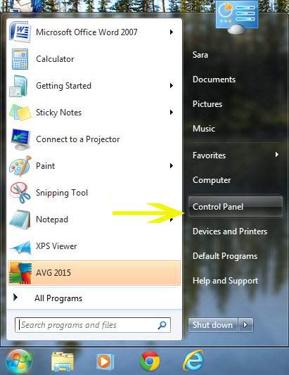 - On the home screen Click on the “Start” button then go to “Control Panel.”