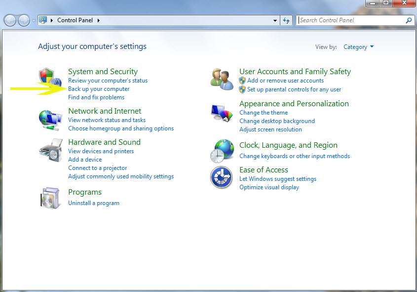 - In the next Screen you will see “Back Up your Computer” which is under “System and Security.” Now Click on “Back Up Your Computer”