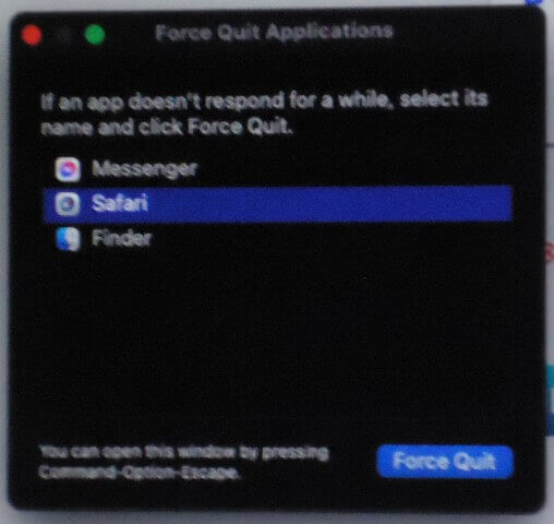 When the box opens, click on Safari in this case, and then click on Force Quit. You’ll get a confirmation box asking, “Do you want to force “Safari” to quit? You will lose any unsaved changes.” Click on Force Quit again.