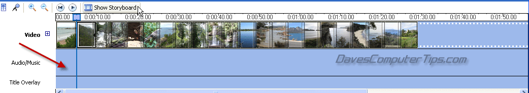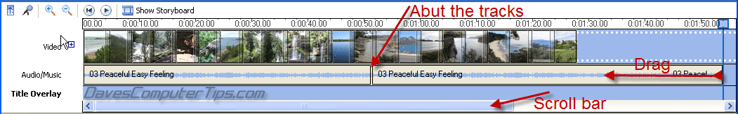 If your project includes lots of photos you will need to add the same track multiple times or import and add different tracks until such time as the audio timeline is past the video display timeline. After placing the first audio track on the timeline use the horizontal scrollbar to locate the end of that track and then drag and drop the next song so that the beginning of the second track abuts the end of the first track, and so on. You can shorten up the final song/music by hovering the mouse cursor over the end of the track until the cursor turns into opposing red arrows, then simply hold down the left button and drag it to a position just after the end of video display: