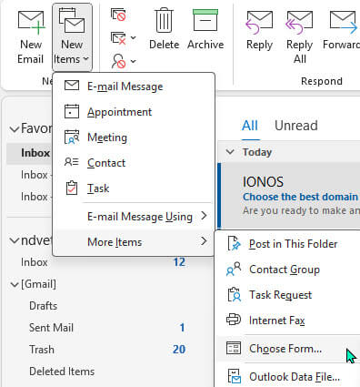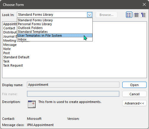 - Select More Items > Choose Form. This will open a window showing several locations where your template could be located.