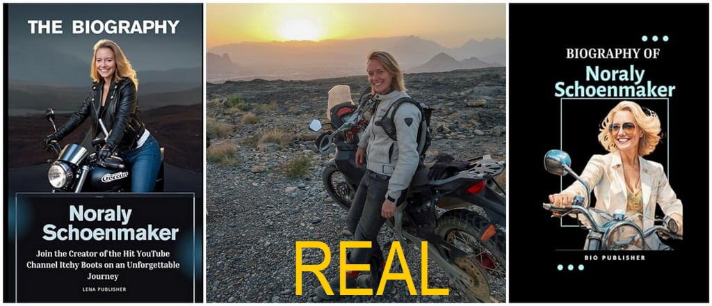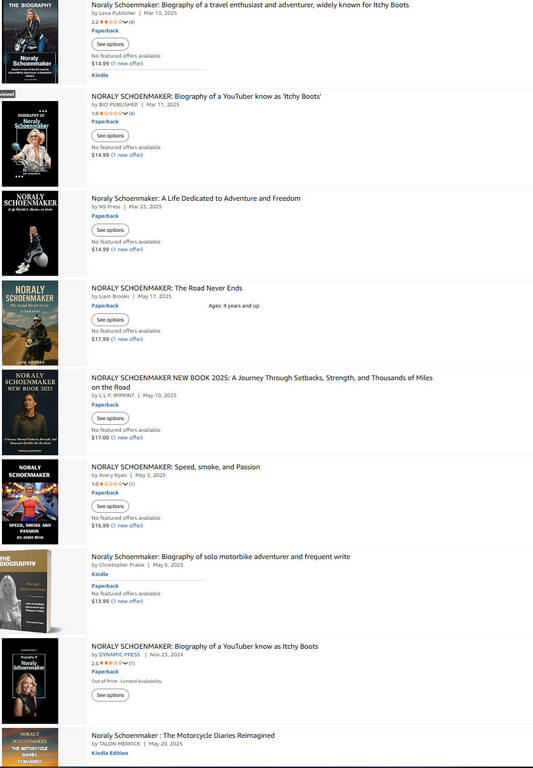In June last year, I wrote Itchy Boots Has Accident In Africa and in 2022, I wrote How ItchyBoots Became A YouTube Sensation. During her recovery period in Holland, Noraly Schoenmaker wrote a book, Free Ride, due to be published in English on June 3rd, 2025. The new book gives an honest account of how she came to acquire her Royal Enfield Himalayan and decided to set off riding around India, Myanmar, and countries you and I will probably never visit. I already knew that she had published her new book in Dutch and was keenly following the release date of the English version. Anyway, I read about the release date this morning and headed over to Amazon to see for myself. Free Ride is indeed available on that platform from June 3 in both Kindle and hardback versions, but what sparked my curiosity was the number of other books related to Noraly Schoenmaker, purporting to be biographies of her or tales of her motorcycle adventures. They are clearly fakes.