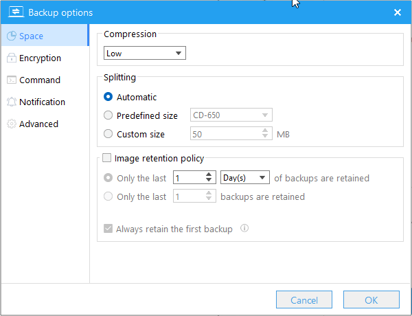 The space settings allow changes to the compression level, the ability to split the backup images into file sections, and the image retention policy.