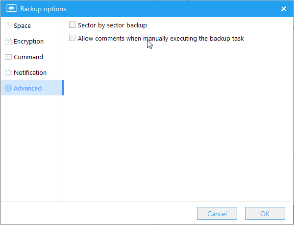 Under the Advanced tab, a sector-by-sector backup can be selected to back up all sectors of the partitions regardless of whether the sectors are used by the file system.