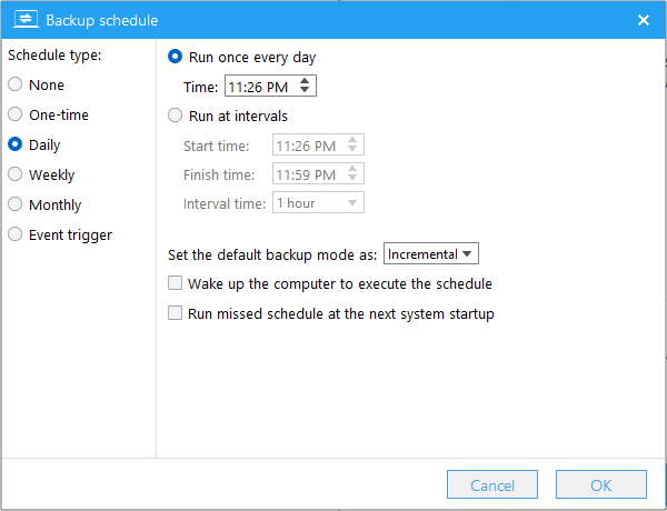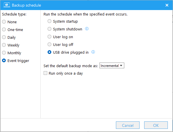 Different types of backups (Full, Incremental, or Differential) can be scheduled to take place on a daily, weekly, monthly, or even based on an event. One interesting event trigger is USB drive is plugged in. If your target disk is a USB device, the defined operation will not occur until that device is seen through the event. This allows a task to be set up to image your system on an external USB device and automatically do an update each time that USB device is plugged into the system with a once-a-day limit option. A convenient and useful way to back up the system if you are using an external device.