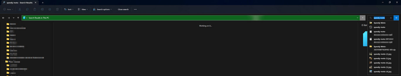 Windows Search is a frustrating, tiresome, and endlessly long process that hasn’t improved much during the many years that I’ve been using Windows. When Windows Vista was released in 2007, search and indexing were much vaulted, but the reality was that the indexing process simply brought our PCs to a grinding halt, so most people turned that feature off, if they could. In the intervening years, Windows Search still hasn’t improved. In fact, a simple Google search is infinitely faster and I’m often left scratching my head as to why such an important feature of the most widely used operating system in the world still runs at a snail’s pace or slower. Here’s an example of a Windows Search for anything related to Speedy Moto, my courier service, when I was searching all files related to it: