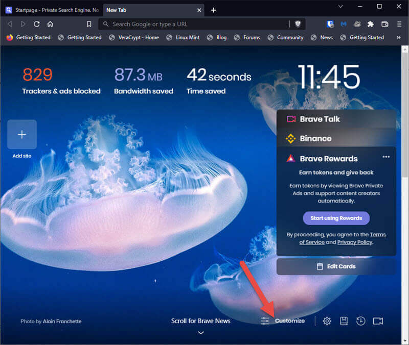 However, when the browser’s home page opened, I was surprised to see how busy it is. With a fancy background image that changes frequently and lots of graphics, it is a bit of a shock if you’re used to the simplicity of (say) Chrome or Edge. The good news is that, if you’re of the same mind as me and have no use for all those extraneous items, they can easily be removed via the Customize link toward the bottom right of the page:
