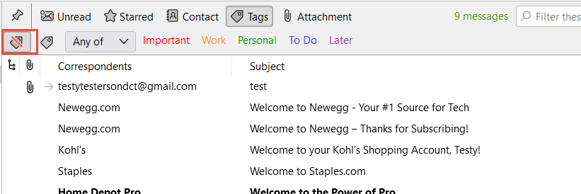 An additional tags toolbar will display. From this toolbar, messages to display with all tags, individual tags, or a combination of tags can be selected. As in Thunderbird, tagged messages can be selected: