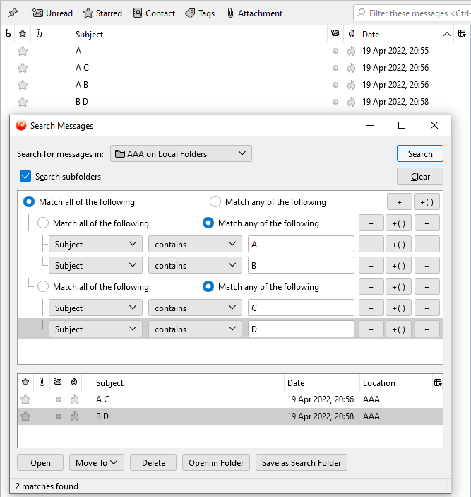 - Complex Search Terms offer searching with complex searches. While Thunderbird is limited to one set of search terms, Betterbird allows multiple groups of search terms. From the menu, a complex search is performed by selecting Edit / Find / Search Messages