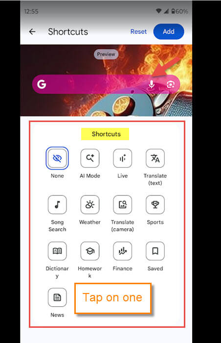 Step 7: Here are all the Shortcuts you can add to the Search Widget. You can only pick one, so choose wisely. After that, if you are happy with it, tap the Add button at the top right.