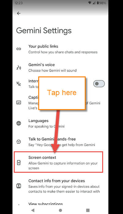 Step 5: Now we are on the Gemini Settings screen. The option that I want you to turn off is called Screen context: