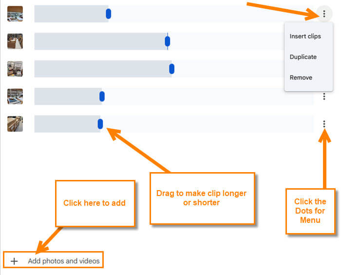 Second section: This is on the right of the screen where you can adjust how long the image or video plays. There are 3 dots to the right of each one. Click that, and you will get this menu: