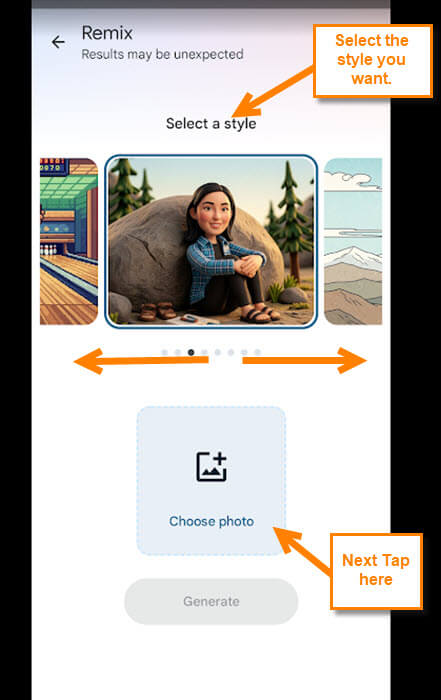 - Once the Style is selected, look below that. You will see a box that says Choose Photo. Tap it, and it will take you to the photos screen. Find the photo you want to remix and select it