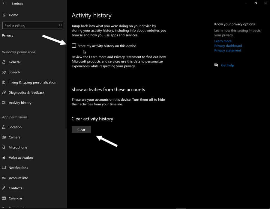 For Windows 11, press Windows key + i, then click on Privacy & security, then scroll down to uncheck the Store my activity history on this device box under the Activity History privacy page.