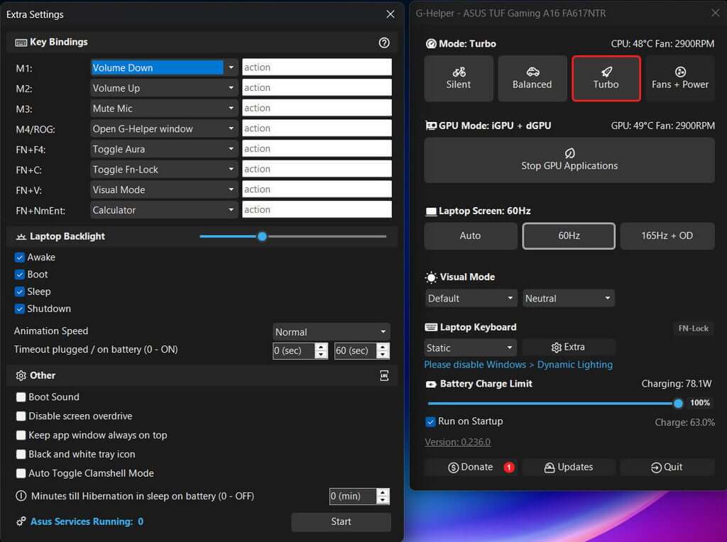 By this point, I’m banging my head against a brick wall, having read hundreds of forum posts and falling into one rabbit hole after another, but determined to find a solution because that’s in my nature. Having got rid of the bloatware, I installed G-Helper, a free 4MB utility for Asus laptops for tweaking numerous configurations.