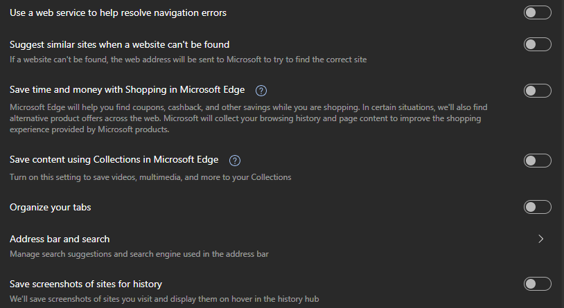 There is a lot to get through, so much of what follows consists of screenshots. However, they are pretty much self-explanatory, and I’ll pop in a brief explanation here and there as required. To access these settings in Edge, you need to navigate to the Privacy, search, and services section: