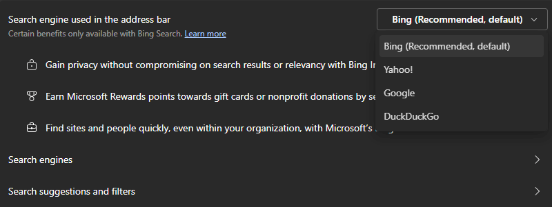 Search and connected experiences > Address bar and search: Bing is the default search engine. Expand the dropdown menu and select DuckDuckGo: