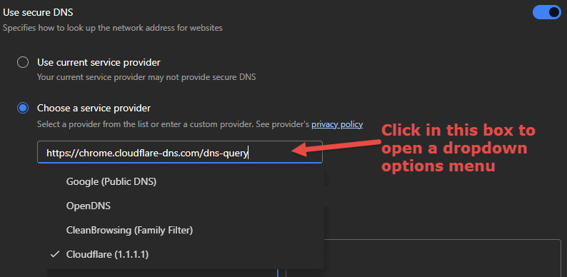 Security – Use secure DNS: This is set to your current ISP by default, which is about as far from secure (and private) as you can get. Enable the option to Choose a service provider and then select a provider from the dropdown list of options. Cloudflare would be my recommendation:
