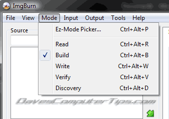 Insert a blank DVD into the ROM-Drive, open ImgBurn and select the option to Write files/folders to disc. Click on the Mode tab and make sure the Build option is enabled (ticked):