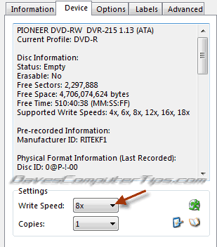 Now click on the Device tab and select the burning speed. Bear in mind here; slower is better… but we also don’t want to be waiting forever for the burn process to complete. I generally select 8x as a nice compromise between speed and assurance of burn quality: