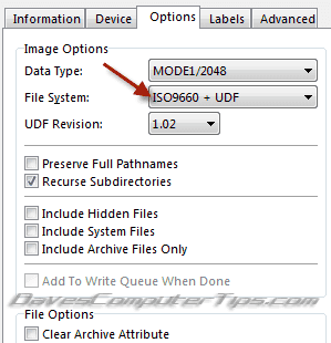 Now click on the Options tab and make sure ISO9660+UDF is selected in the ‘File System’ drop down box. This should be selected by default but best to double check it: