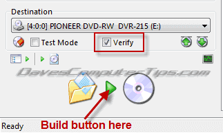Now all that’s left to do is click on the Build button. You can also place a checkmark in the Verify box if you wish to enable that option (takes a little longer but verifies burnt data matches that of source files):