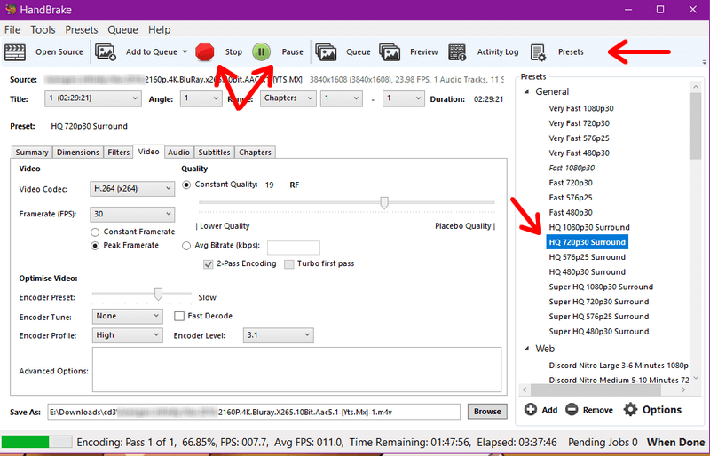 I chose HQ 720p30 Surround as my output. I also changed the folder to save the file. And then I clicked on the Start Encode button. It changes to a Stop and Pause button when the encoding is taking place.