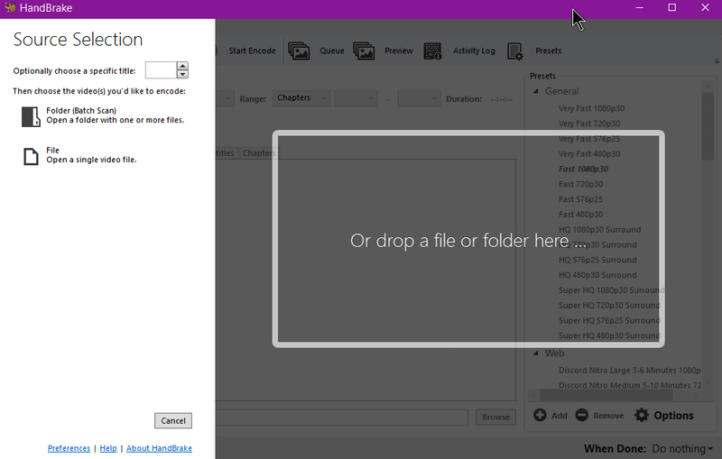 And that is the Presets. So I opened the file in Handbrake (add your file(s)). You can navigate to it, but I prefer the drag-and-drop method.