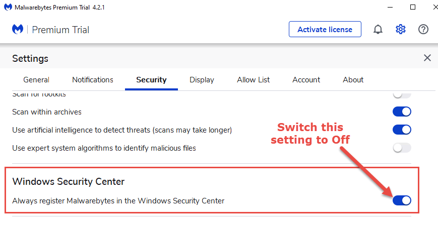 Run Malwarebytes and go to Settings (click on the cog icon), then click and open the Security tab. Scroll down to the Windows Security Center section and turn off the setting to "Always register Malwarebytes in the Windows Security Center" (see attached screenshot). Close Malwarebytes and restart the computer. Let us know if that fixed it.