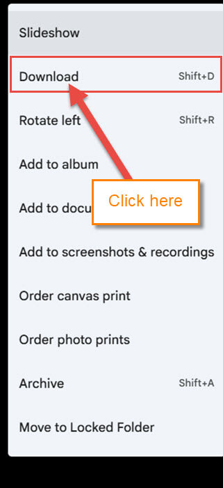 Step 5: Find something to download from the browser. I went to my Google Photos, and this is the menu you will get. Click the Download option.