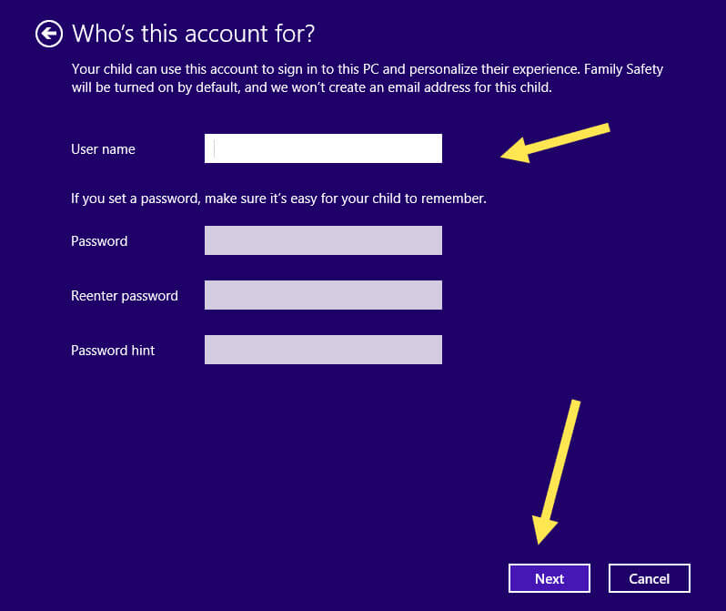 Here you can start by entering your child’s name and create a password for them. I suggest always setting up passwords even if this is only used at home. Make sure to add the password hint but do not make the password hint the same as the password. I have had many clients think that was a cleaver way of getting the password they have forgotten. Not very safe, so just give yourself a good hint to remind you what it could be. Now click the “Next” link at the bottom.