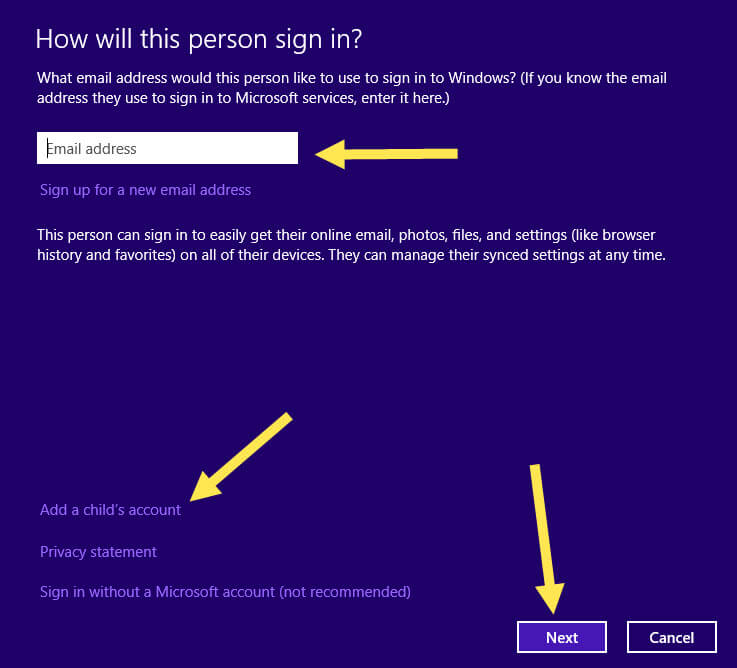 This is the place where you have to decide how you want to set up your child’s account. You have 2 choices here; the first one is if you think your child is mature enough to give them a Microsoft Account which will give them access to their Xbox Live, Skype or whatever else they are connected to with Microsoft. If they have one set up already just type that info in. If you’d rather not do it that way then choose the option to set them up without an email account. In this article I will walk you through the no email option.