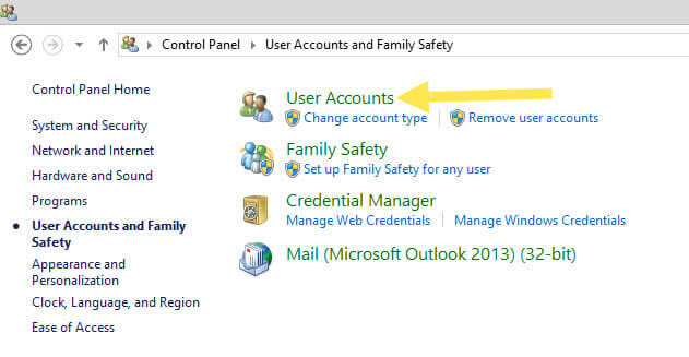 Now you will need to click on the “User Accounts and Family Safety” link, Which is on the right of your screen. Click it.