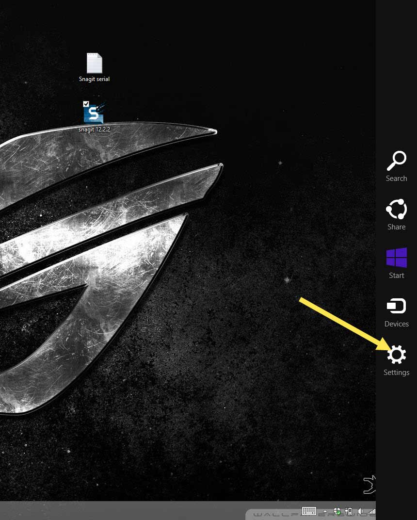 First thing you want to do is find “Settings.” This can be easily found on the desktop or the app screen just by moving your mouse to the bottom right corner of your screen or, if you have a touch screen, just swipe from the right side of the screen. This should bring out the hidden side bar (Charms bar).