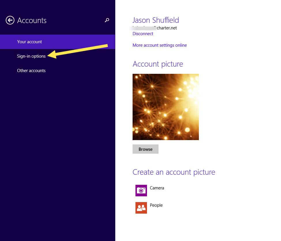 Here you will see three options to choose from on the left side. “Your Account,” “Sign-in Options,” or “Other accounts.” Since I have only one account in this scenario, we are going to choose the link that says “Sign-in options.” Click it.