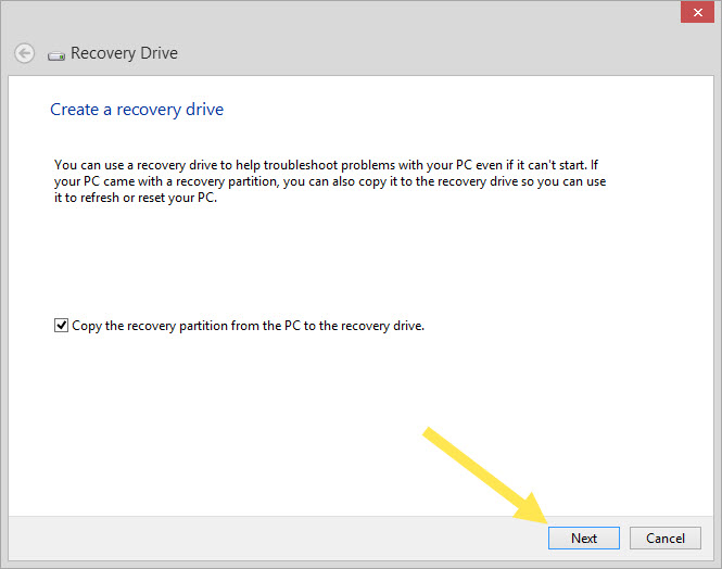 - Now the “Create a recovery drive” box will appear. Here you want to make sure the “Copy the recovery partition from the PC to the recovery drive” box is checked.