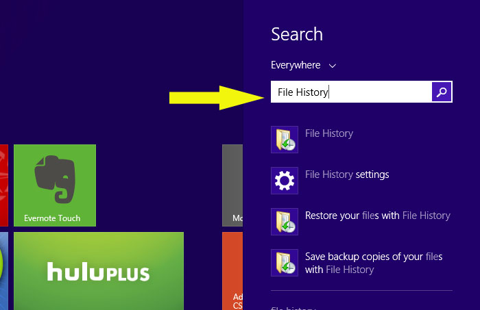 - In Windows 8.1 go to the search and type in “File History.” You should see the folder “File History” showing up below the search box. Click on this Icon.