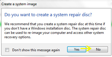 - Once the process is complete you will see an option to create a system repair disc. On this box click “NO” to skip the system repair disc creation process. I will be covering how to create a system repair disc in another article.