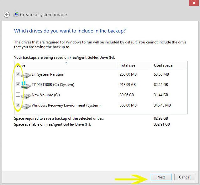 - Once you have chosen your drive to back up your system image to you will see a new screen. This is where you choose the drives you want to have backed up. Simply check the boxes next to the drives you want. Some are defaulted so you will not be able to uncheck them. Now Click “Next”