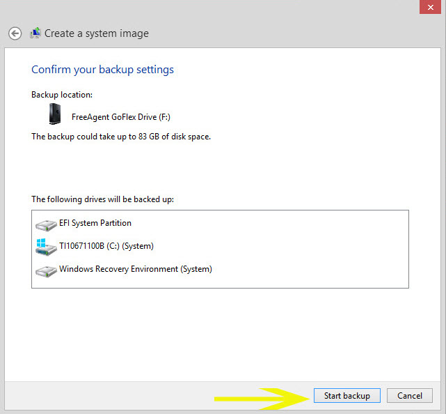 - Now you will see a confirmation screen that will show you the amount of space the back up image will take. This is why I said to choose the one with the most space and suggested using a external hard drive. If you need to make any changes this is the point you can still go back. This is the point of no return! Now all you have to do is click “Start Backup.”