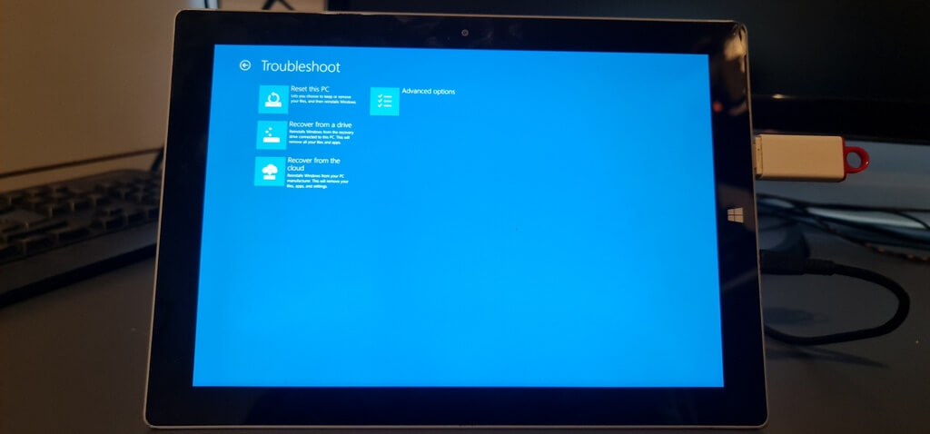I downloaded the Windows 10 version 1511 image to my PC, copied the files to my Recovery pen drive, and then inserted it into the Surface, ensuring that it was switched off. Then, holding the volume down key, pressing and releasing the power button, I released the volume down key when the Surface logo appeared. I then landed at the recovery screen, which is what you would see in any Windows 10 environment, and with the now functioning touch screen, I hit troubleshooting>recover from a drive.