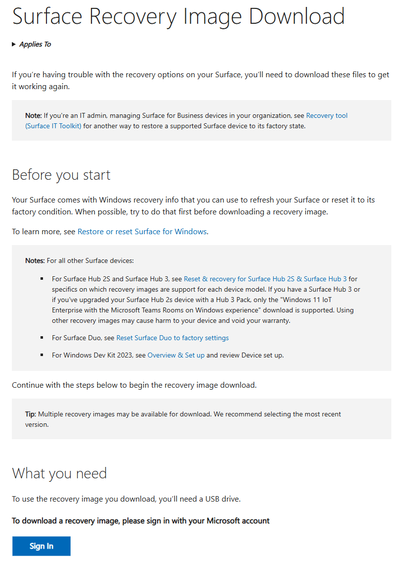 I initially tried to boot the tablet from a pen drive prepared with Windows 10 through Rufus, and I managed to get to the Windows install screen, but with no touch screen drivers installed, this was going nowhere very fast. Duh!! I then did the sensible thing and found the Microsoft page for recovering the device. However, you have to be signed in before going any further.